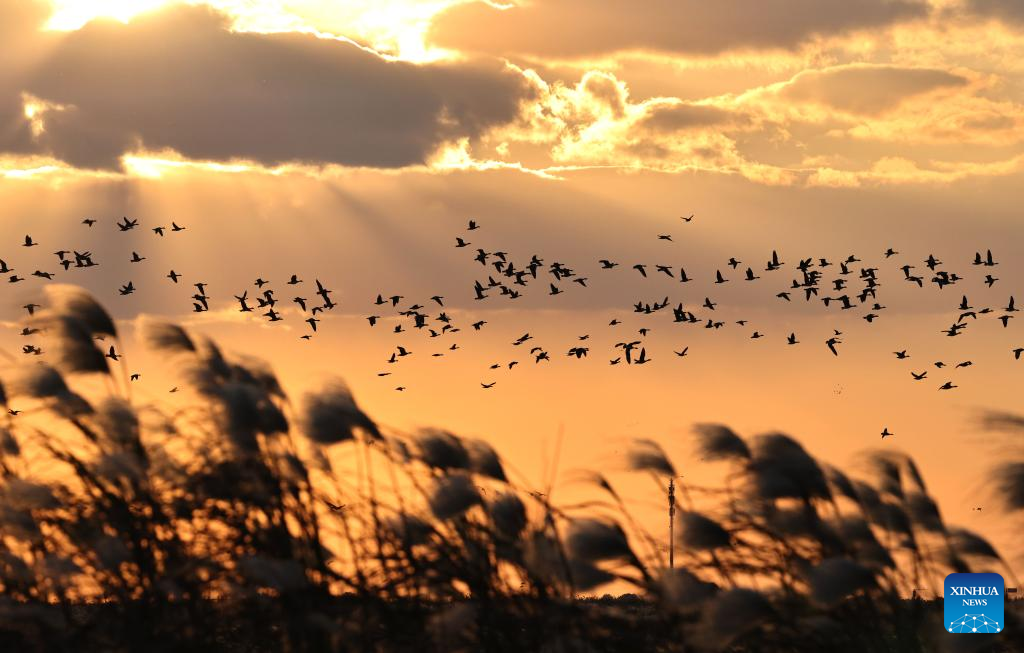 Migratory birds fly over the Yellow River Delta National Nature Reserve in east China's Shandong Province, Nov. 12, 2023. Five nominated sites of the migratory bird sanctuaries along the coast of Yellow Sea-Bohai Gulf of China successfully passed the review process Friday to be included on the World Heritage List by the United Nations Educational, Scientific and Cultural Organization (UNESCO). The decision was made during the 46th session of the UNESCO World Heritage Committee held in New Delhi, India, according to China's National Forestry and Grassland Administration. (Xinhua/Xu Suhui)