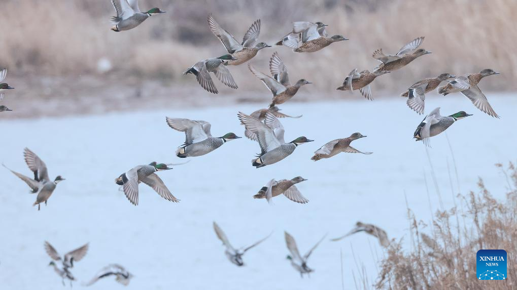 Falcated ducks fly over the Chongming Dongtan National Nature Reserve in Shanghai, east China, Feb. 6, 2024. Five nominated sites of the migratory bird sanctuaries along the coast of Yellow Sea-Bohai Gulf of China successfully passed the review process Friday to be included on the World Heritage List by the United Nations Educational, Scientific and Cultural Organization (UNESCO).