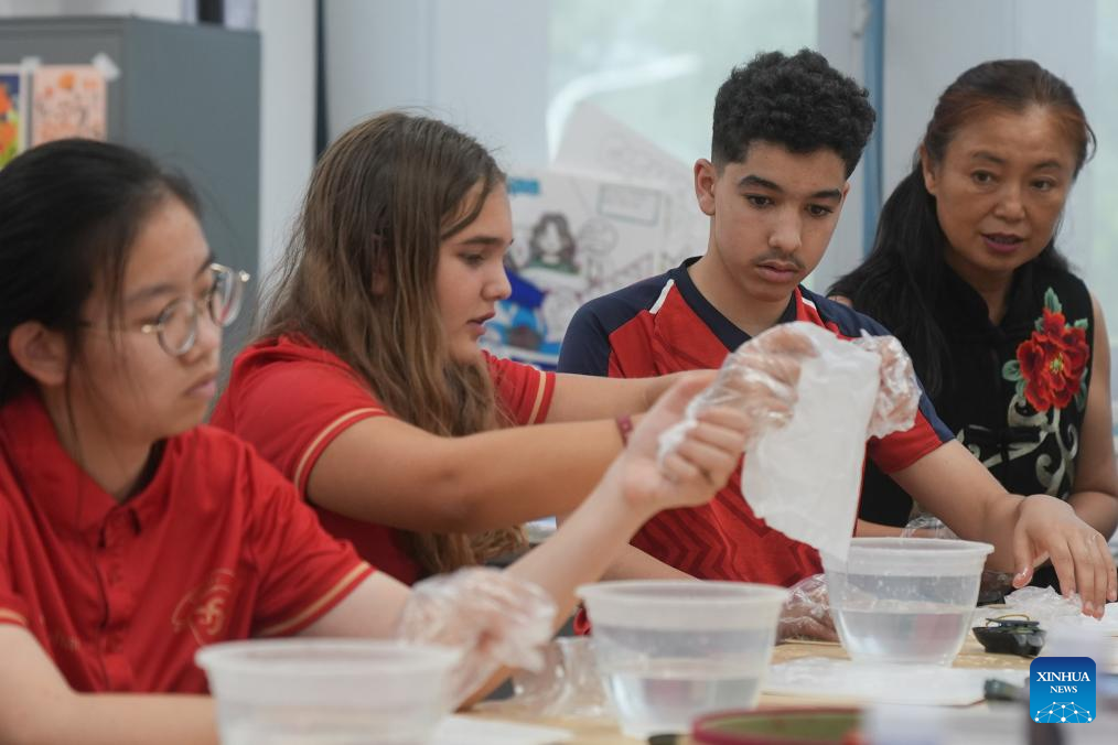 Teenagers from China and France experience tie-dye at ISA Wuhan School in Wuhan, central China's Hubei Province, July 26, 2024. During the 11-day China-France teenagers' summer camp, 20 French teenagers aged 12 to 15 experienced Chinese traditional culture and carried out rich sport activities to enhance cultural exchange and mutual understandings. (Xinhua/Du Zixuan)