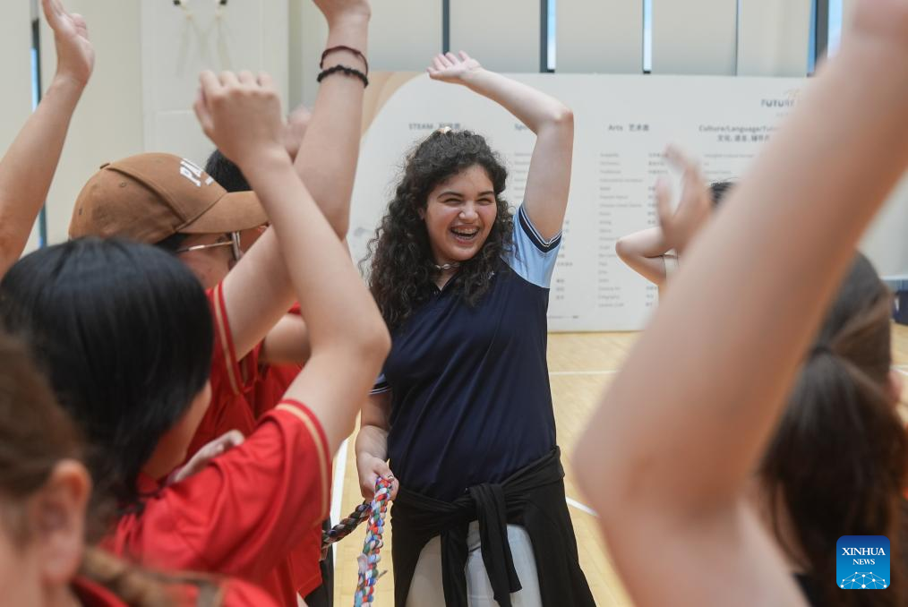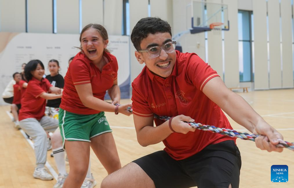 Teenagers from China and France cheer before competing in a tug-of-war race at ISA Wuhan School in Wuhan, central China's Hubei Province, July 26, 2024. During the 11-day China-France teenagers' summer camp, 20 French teenagers aged 12 to 15 experienced Chinese traditional culture and carried out rich sport activities to enhance cultural exchange and mutual understandings. (Xinhua/Du Zixuan)