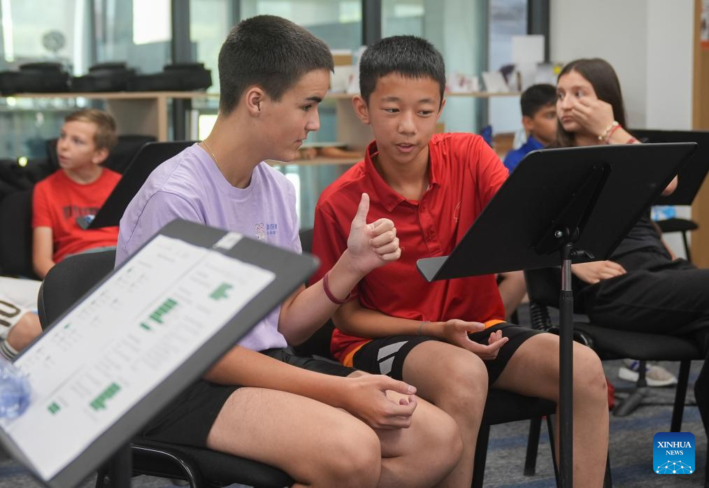 Teenagers from China and France attend a chorus class at ISA Wuhan School in Wuhan, central China's Hubei Province, July 26, 2024. During the 11-day China-France teenagers' summer camp, 20 French teenagers aged 12 to 15 experienced Chinese traditional culture and carried out rich sport activities to enhance cultural exchange and mutual understandings. (Xinhua/Du Zixuan)