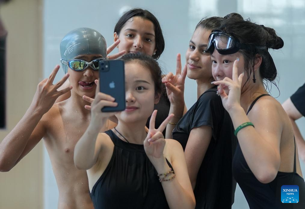 Teenagers from China and France take selfies at a swimming class at ISA Wuhan School in Wuhan, central China's Hubei Province, July 26, 2024. During the 11-day China-France teenagers' summer camp, 20 French teenagers aged 12 to 15 experienced Chinese traditional culture and carried out rich sport activities to enhance cultural exchange and mutual understandings. (Xinhua/Du Zixuan)