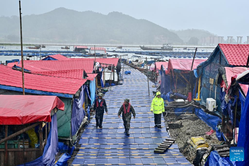 Staff members patrol at the seaside of Xiapu County in Ningde, southeast China's Fujian Province, July 26, 2024. As of 6 a.m. Friday, about 628,600 people in east China's Fujian Province had been affected by Typhoon Gaemi, the third typhoon of this year, with some 290,000 residents relocated so far, said local authorities. Rescue and relief work and post-disaster reconstruction are underway. (Xinhua/Jiang Kehong)