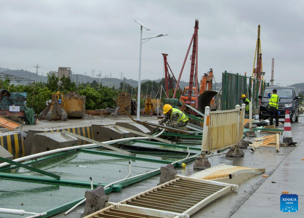Staff members repair fences of a construction site near the Minjiang River estuary wetlands in Fuzhou, southeast China's Fujian Province, July 26, 2024. As of 6 a.m. Friday, about 628,600 people in east China's Fujian Province had been affected by Typhoon Gaemi, the third typhoon of this year, with some 290,000 residents relocated so far, said local authorities. Rescue and relief work and post-disaster reconstruction are underway. (Xinhua/Wei Peiquan)