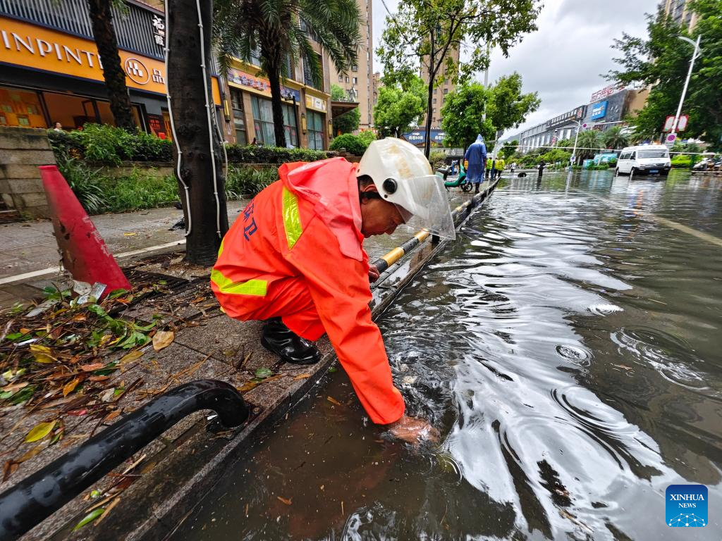 A sanitation worker unclogs a drainage hole in a flooded area of Xiapu County in Ningde, southeast China's Fujian Province, July 26, 2024. As of 6 a.m. Friday, about 628,600 people in east China's Fujian Province had been affected by Typhoon Gaemi, the third typhoon of this year, with some 290,000 residents relocated so far, said local authorities. Rescue and relief work and post-disaster reconstruction are underway. (Xinhua/Jiang Kehong)