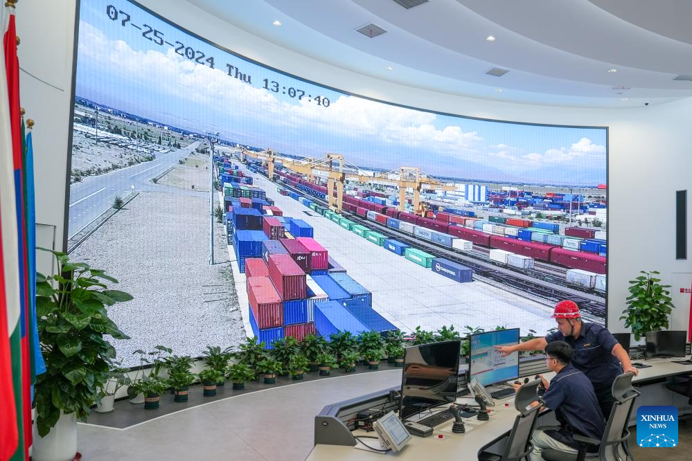 Bedelov Azilkhan (R) and his colleague monitor a container yard at the China-Kazakhstan (Lianyungang) Logistics Cooperation Base in Lianyungang, east China's Jiangsu Province, July 25, 2024. (Xinhua/Li Bo)
