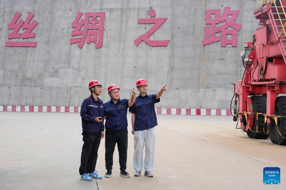 Bedelov Azilkhan (C) and his colleagues work at the China-Kazakhstan (Lianyungang) Logistics Cooperation Base in Lianyungang, east China's Jiangsu Province, July 25, 2024. (Xinhua/Li Bo)