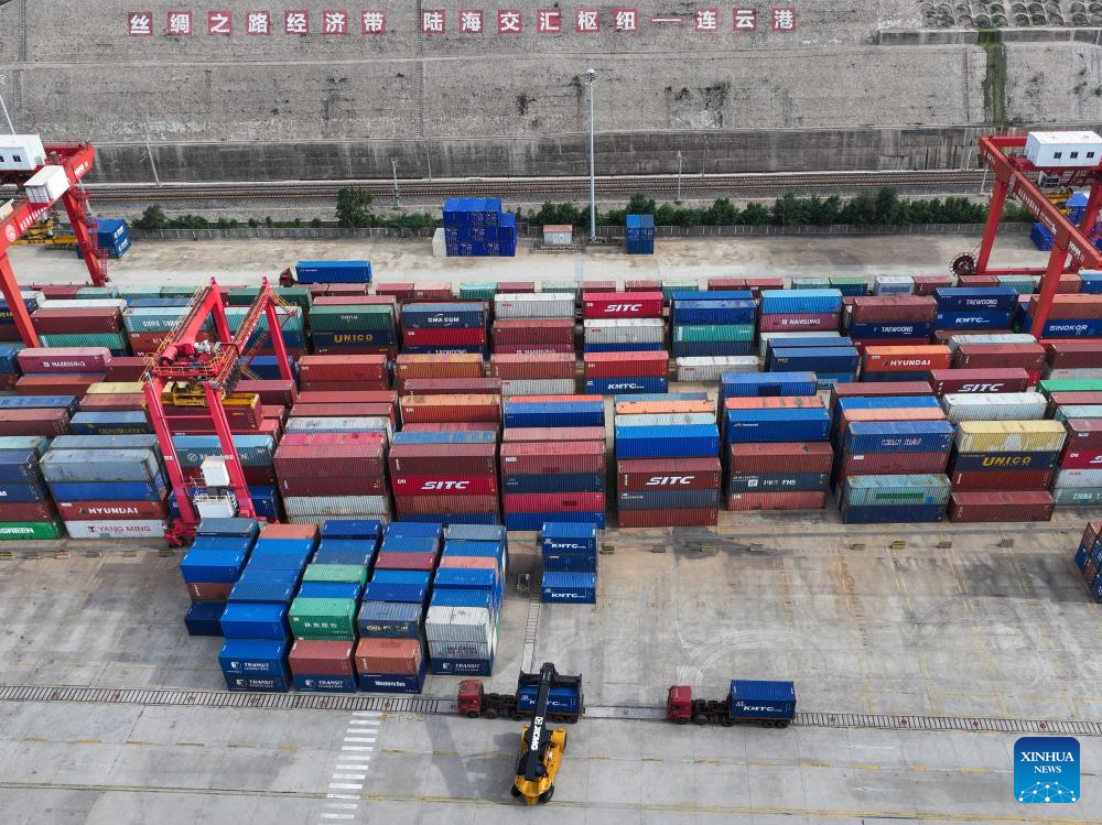 Today, the China-Kazakhstan (Lianyungang) Logistics Cooperation Base boasts a 220,000 square meter container yard and a 3.8-kilometer dedicated railway line. It has become a crucial platform for transit, warehousing, and trade between Central Asian countries. (Xinhua/Li Bo)