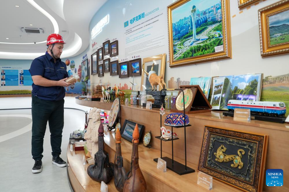 Bedelov Azilkhan arranges goods at an exhibition hall at the China-Kazakhstan (Lianyungang) Logistics Cooperation Base in Lianyungang, east China's Jiangsu Province, July 25, 2024. (Xinhua/Li Bo)