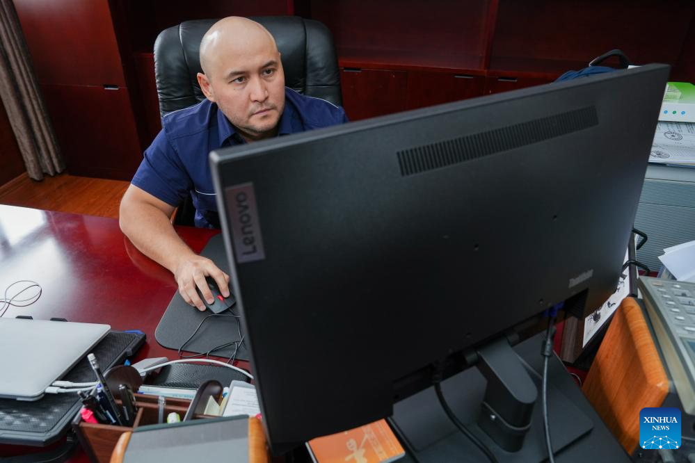 Bedelov Azilkhan checks emails at office at the China-Kazakhstan (Lianyungang) Logistics Cooperation Base in Lianyungang, east China's Jiangsu Province, July 25, 2024. (Xinhua/Li Bo)