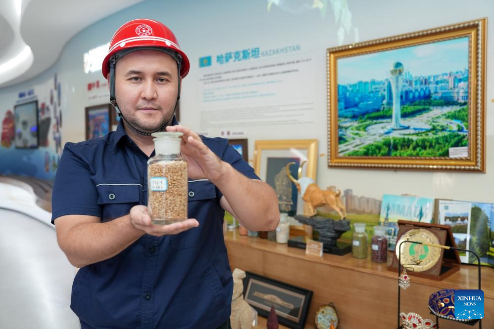 Bedelov Azilkhan shows a bottle of wheat samples at the China-Kazakhstan (Lianyungang) Logistics Cooperation Base in Lianyungang, east China's Jiangsu Province, July 25, 2024. (Xinhua/Li Bo)