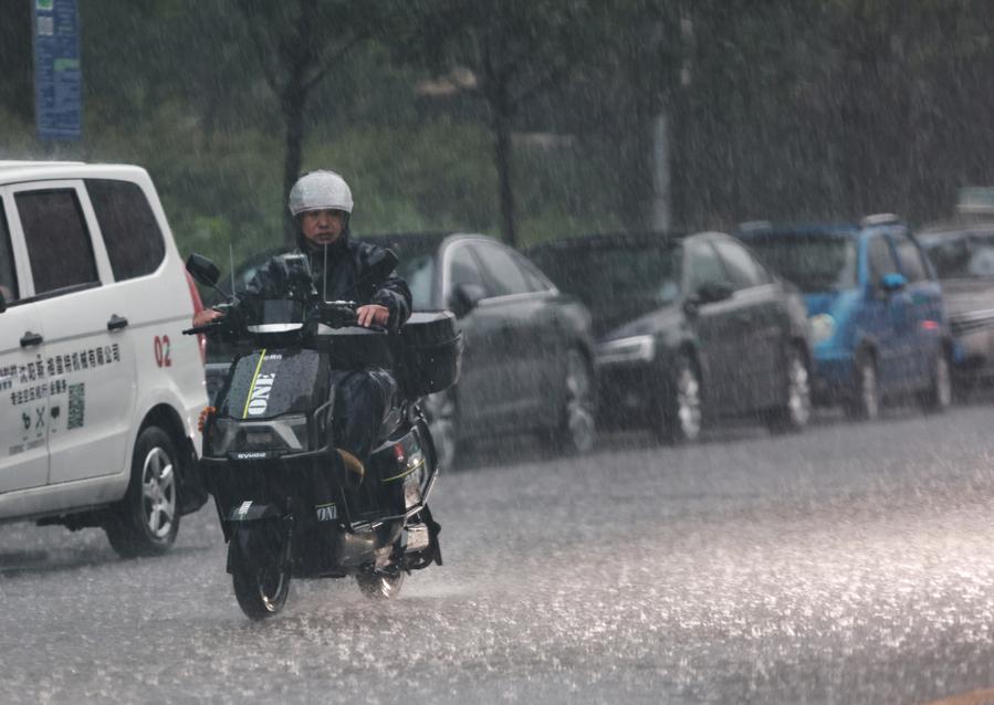 A man rides amid downpour in Shenyang, northeast China's Liaoning Province, July 26, 2024. (Xinhua/Yang Qing)