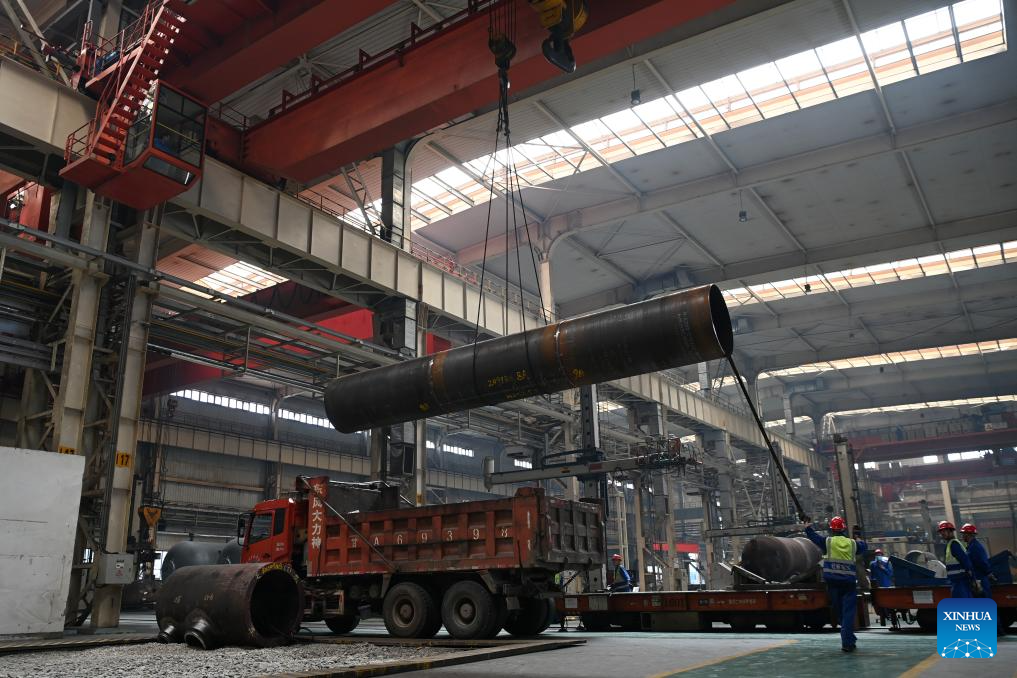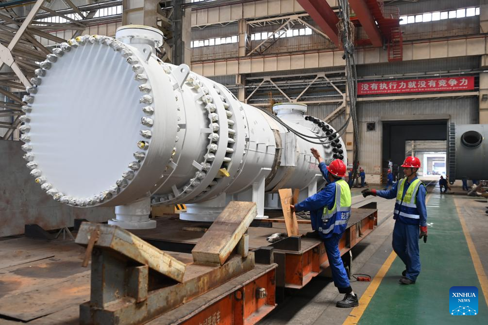Workers hoist an equipment in a workshop of LS Group High Tech Equipment Industrial Park of Lanzhou New Area in Lanzhou, northwest China's Gansu Province, July 25, 2024. In recent years, Lanzhou New Area has introduced 1,080 high-quality industrial projects with a total investment of 528 billion yuan (about 72.8 billion U.S. dollars), and the annual increasing rate of industrial added value has maintained over 50 percent. From 2011 to 2023, the regional GDP of Lanzhou New Area has increased from less than 500 million yuan (about 69 million U.S. dollars) to 37.5 billion yuan (about 5.2 billion U.S. dollars). (Xinhua/Fan Peishen)