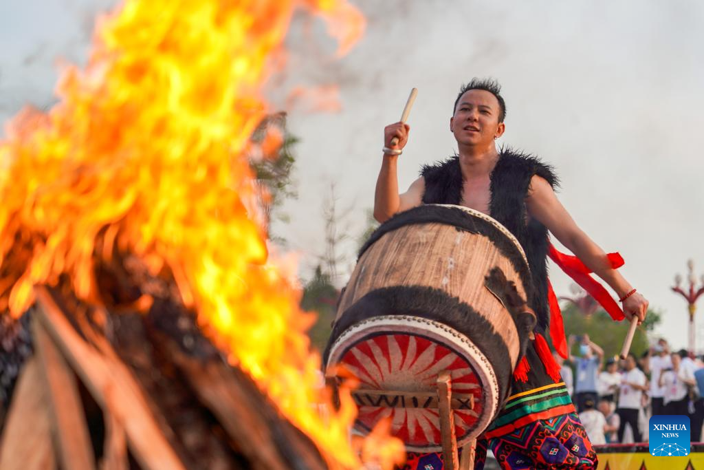 An actor beats a drum to welcome visitors at a torch festival in Chuxiong, southwest China's Yunnan Province, July 27, 2024. A torch festival of the Yi ethnic group kicked off here on Saturday. (Xinhua/Wang Jingyi)