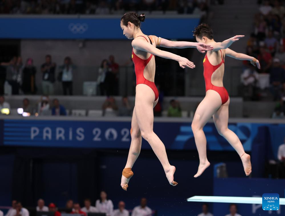 Chang Yani (R)/Chen Yiwen of China compete during the women's synchronised 3m springboard final of diving at the Paris 2024 Olympic Games in Saint Denis, near Paris, France, on July 27, 2024. (Xinhua/Li Ying)