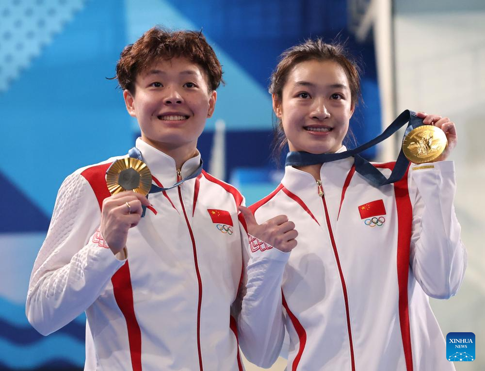 Gold medalists Chang Yani (L)/Chen Yiwen of China celebrate during the awarding ceremony after the women's synchronised 3m springboard final of diving at the Paris 2024 Olympic Games in Saint Denis, near Paris, France, on July 27, 2024. (Xinhua/Zhang Yuwei)