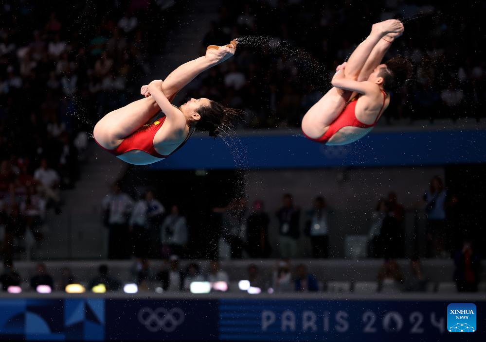 Chang Yani (bottom)/Chen Yiwen of China compete during the women's synchronised 3m springboard final of diving at the Paris 2024 Olympic Games in Saint Denis, near Paris, France, on July 27, 2024. (Xinhua/Li Ming)