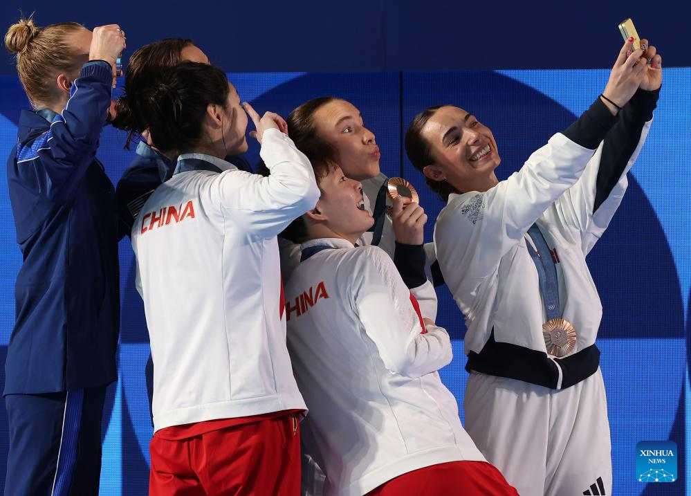 Silver medallists Sarah Bacon/Kassidy Cook of the United States, gold medalists Chang Yani/Chen Yiwen of China and bronze medallists Yasmin Harper/Scarlett Mew Jensen of Britain take selfies during the awarding ceremony after the women's synchronised 3m springboard final of diving at the Paris 2024 Olympic Games in Saint Denis, near Paris, France, on July 27, 2024. (Xinhua/Li Ying)