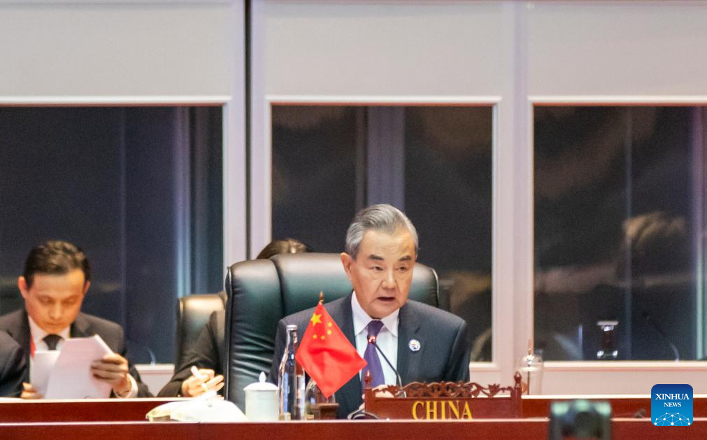 Chinese Foreign Minister Wang Yi, also a member of the Political Bureau of the Communist Party of China Central Committee, attends the foreign ministers' meeting of the 31st ASEAN Regional Forum in Vientiane, Laos, July 27, 2024. (Photo by Kaikeo Saiyasane/Xinhua)