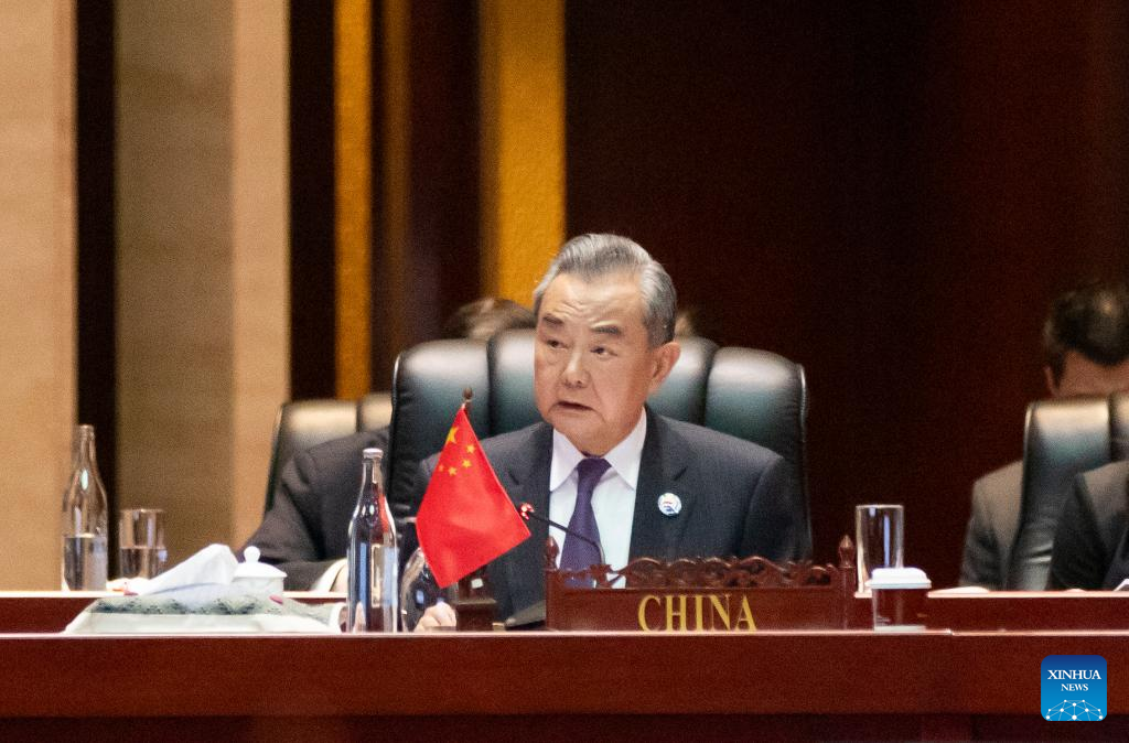 Chinese Foreign Minister Wang Yi, also a member of the Political Bureau of the Communist Party of China Central Committee, attends the 14th East Asia Summit (EAS) Foreign Ministers' Meeting in Vientiane, Laos, July 27, 2024. (Photo by Kaikeo Saiyasane/Xinhua)