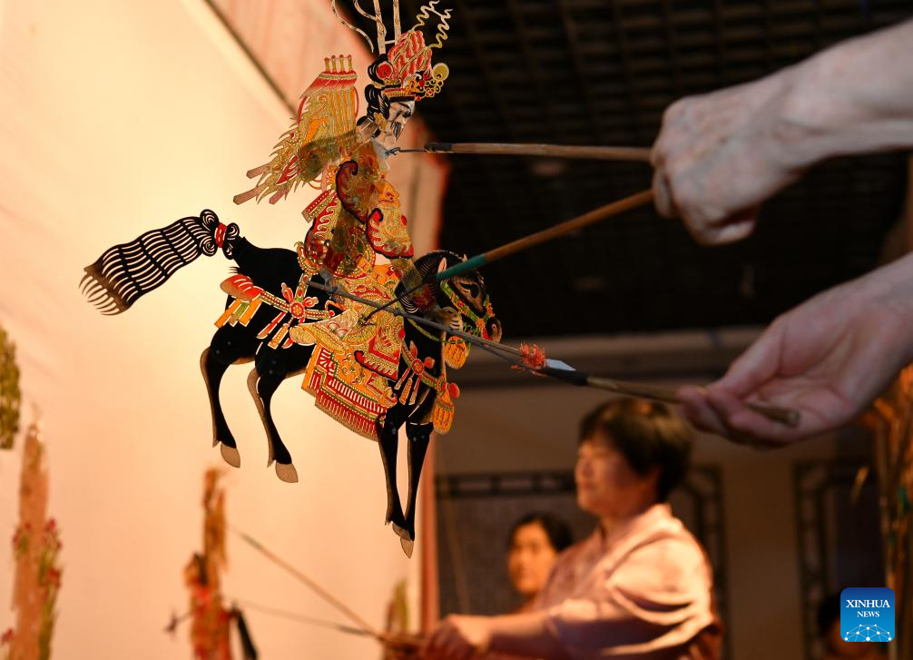 Shadow puppet artists stage a show for pupils at a primary school in Hejian, north China's Hebei Province, July 26, 2024. Various training courses on intangible cultural heritages as shadow puppet, porcelain carving etc. targeting the school children are opened in the city during the summer vacation. (Xinhua/Mu Yu)