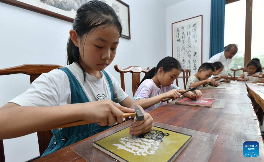 Pupils try the technique of porcelain carving at a museum in Hejian, north China's Hebei Province, July 26, 2024. Various training courses on intangible cultural heritages as shadow puppet, porcelain carving etc. targeting the school children are opened in the city during the summer vacation. (Xinhua/Mu Yu)