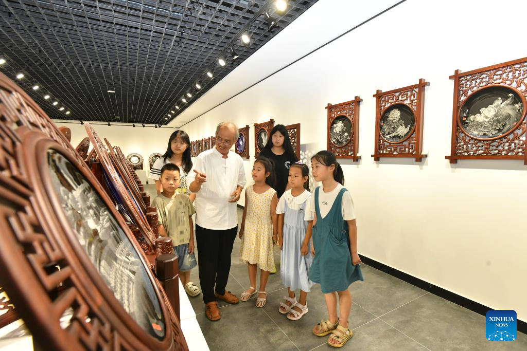 Pupils learn about the technique of porcelain carving at a museum in Hejian, north China's Hebei Province, July 26, 2024. Various training courses on intangible cultural heritages as shadow puppet, porcelain carving etc. targeting the school children are opened in the city during the summer vacation. (Xinhua/Mu Yu)