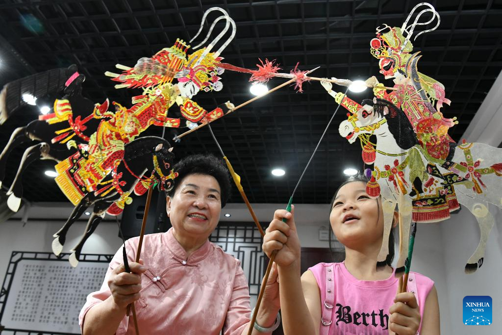 A pupil learns to play shadow puppet at a primary school in Hejian, north China's Hebei Province, July 26, 2024. Various training courses on intangible cultural heritages as shadow puppet, porcelain carving etc. targeting the school children are opened in the city during the summer vacation. (Xinhua/Mu Yu)