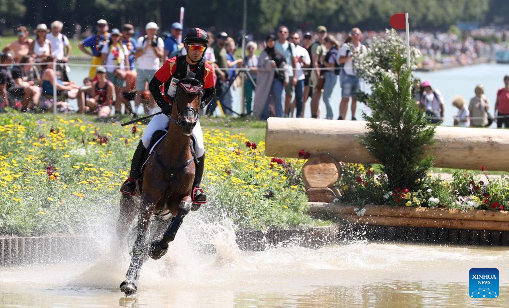 Alex Hua Tian of China competes during the cross-country phase of the equestrian eventing individual competition at the Paris 2024 Olympic Games in Versailles, France, July 28, 2024. (Xinhua/Li Ying)