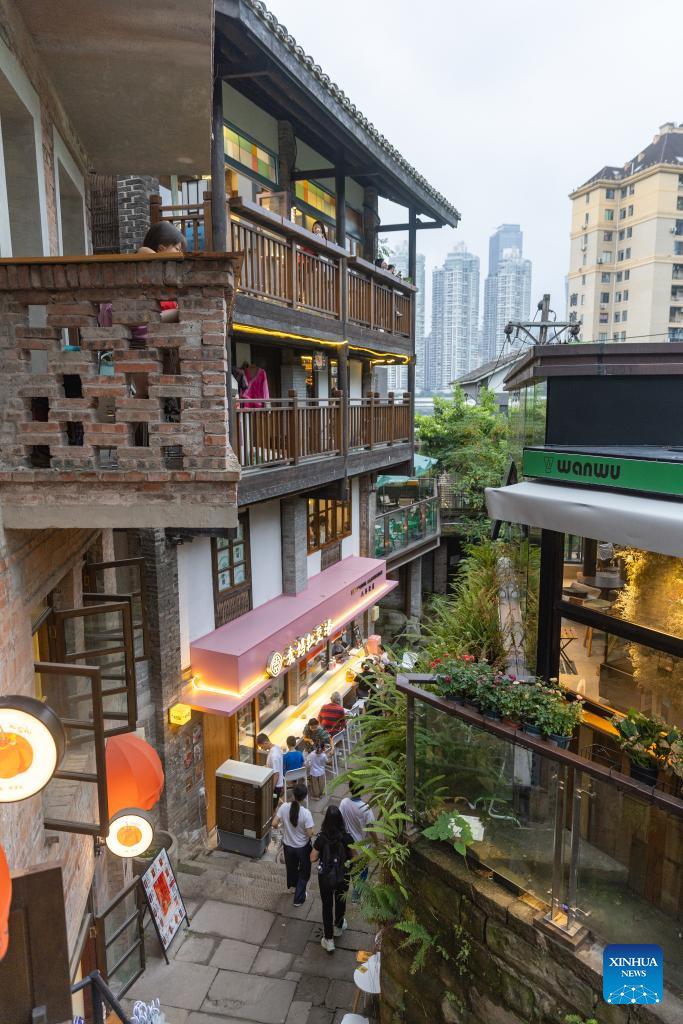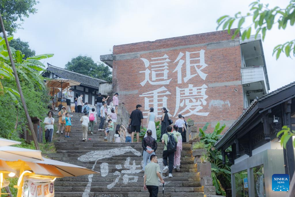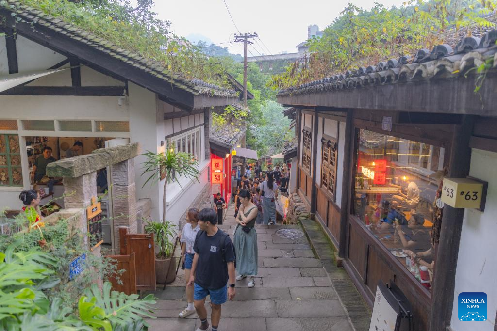 Tourists visit Longmenhao old street in Nan'an District in southwest China's Chongqing Municipality, July 28, 2024. Longmenhao old street, featuring more than 200 ancient architectures built in different forms and periods, was listed in the first batch of urban renewal pilot projects launched by Chongqing. In recent years, local authorities have been integrating natural, cultural, artistic, digital and other elements into the renovation of the street, and readjusting the layout according to its historical and cultural characteristics. The creative renovation and upgrading have incentivized young entrepreneurs, injected new vigor into the street and attracted more visitors. (Xinhua/Huang Wei)