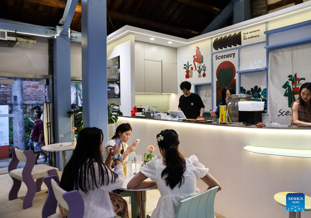 Customers rest at a store on Longmenhao old street in Nan'an District in southwest China's Chongqing Municipality, July 28, 2024. Longmenhao old street, featuring more than 200 ancient architectures built in different forms and periods, was listed in the first batch of urban renewal pilot projects launched by Chongqing. In recent years, local authorities have been integrating natural, cultural, artistic, digital and other elements into the renovation of the street, and readjusting the layout according to its historical and cultural characteristics. The creative renovation and upgrading have incentivized young entrepreneurs, injected new vigor into the street and attracted more visitors. (Xinhua/Lyu Shuai)