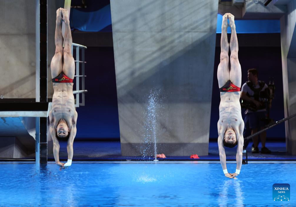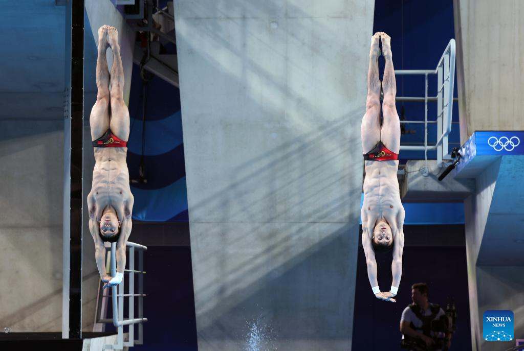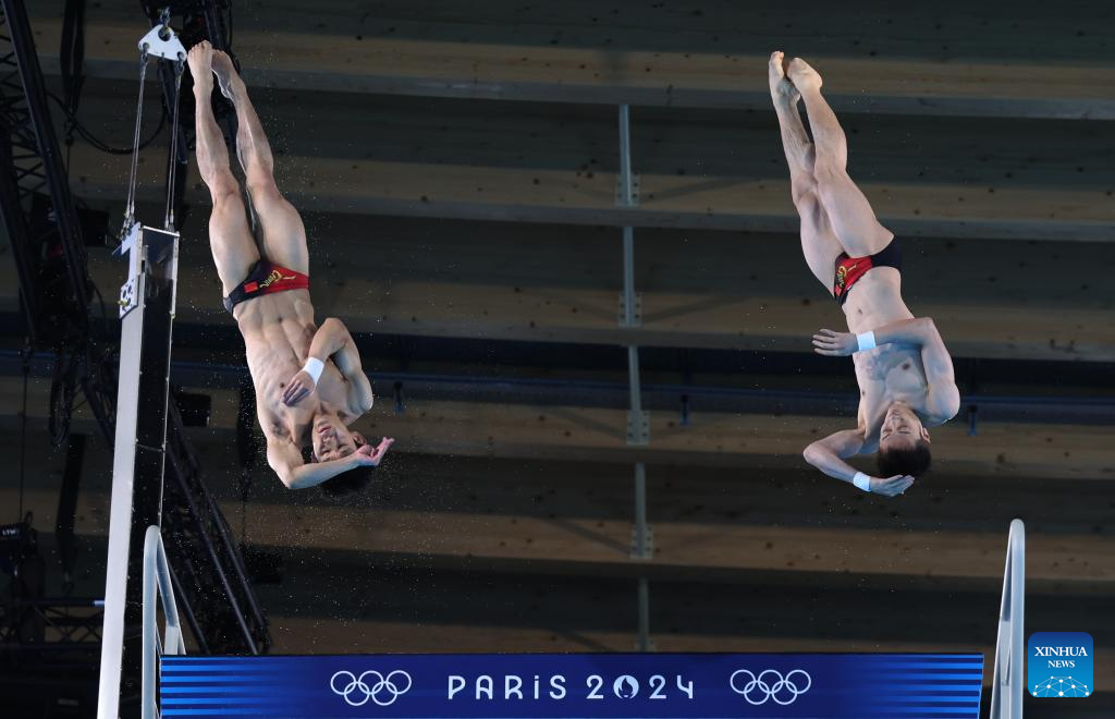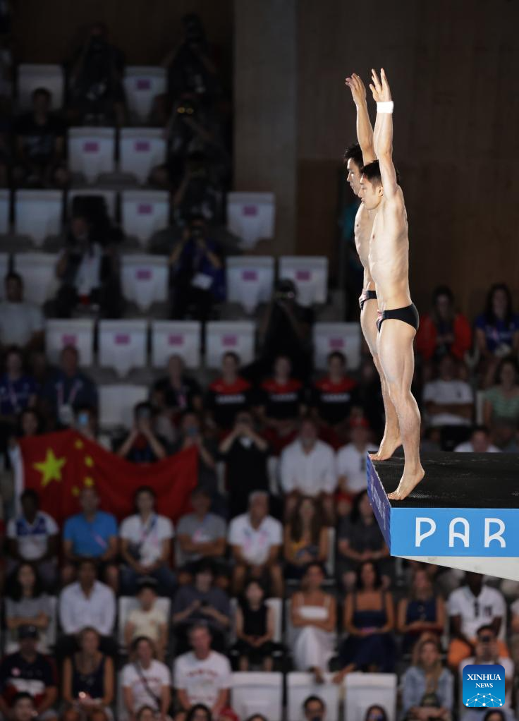 Lian Junjie/Yang Hao of China compete during the men's synchronised 10m platform final of diving at the Paris 2024 Olympic Games in Saint Denis, near Paris, France, on July 29, 2024. (Xinhua/Li Ying)