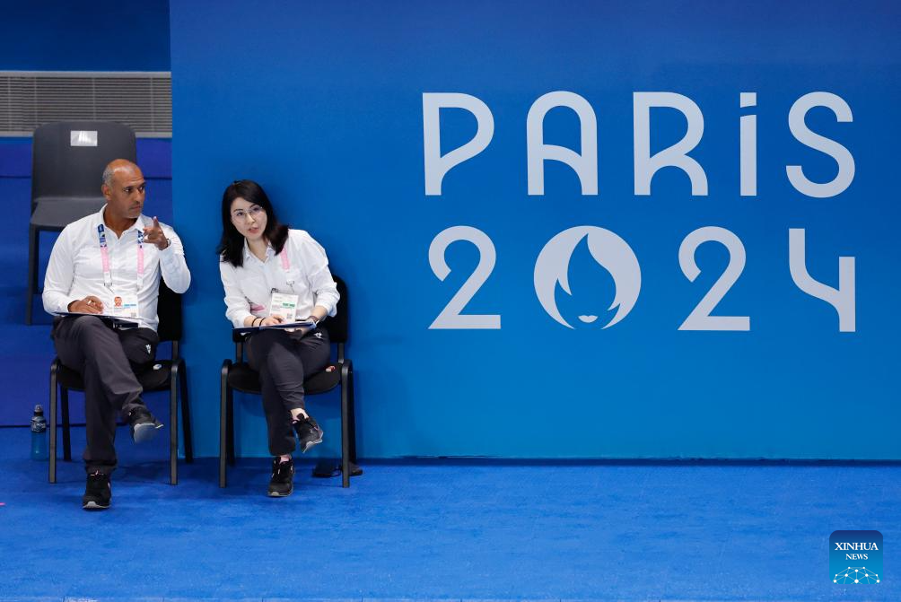 Referee Guo Jingjing (R) is seen before the men's synchronised 10m platform final of diving at the Paris 2024 Olympic Games in Saint Denis, near Paris, France, on July 29, 2024. (Xinhua/Zhang Yuwei)