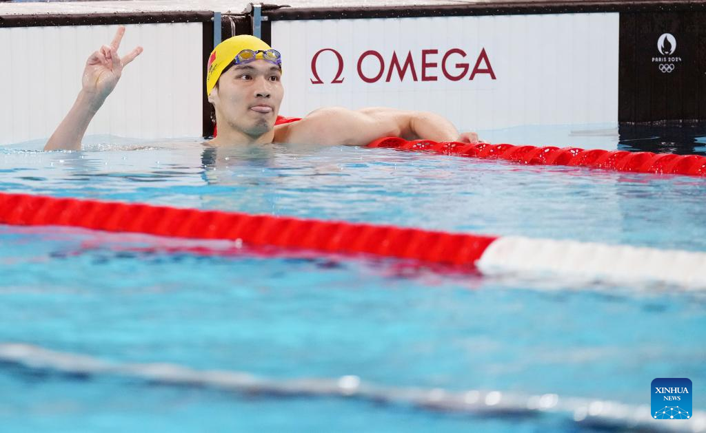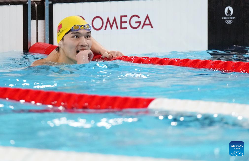 Xu Jiayu of China reacts after the men's 100m backstroke final of swimming at the Paris 2024 Olympic Games in Paris, France, July 29, 2024. (Xinhua/Xue Yuge)