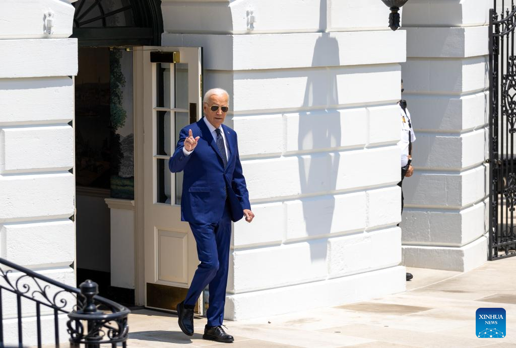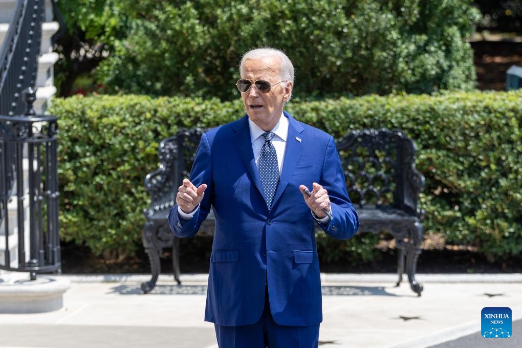 U.S. President Joe Biden speaks to reporters as he walks toward the South Lawn to board Marine One at the White House in Washington, D.C., the United States, on July 29, 2024. (Xinhua/Hu Yousong)