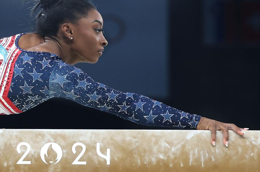 Simone Biles of the United States competes during the balance beam event of the artistic gymnastics women's team final at the Paris 2024 Olympic Games in Paris, France, July 30, 2024. (Xinhua/Cao Can)