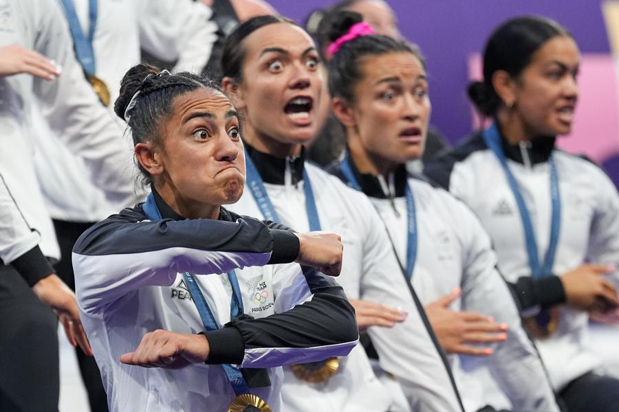 Team New Zealand celebrate during the victory ceremony of the women's rugby sevens at Paris 2024 Olympic Games in Paris, France, July 30, 2024. (Xinhua/Xu Chang)