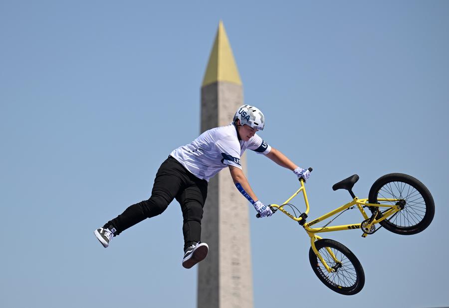 Hannah Roberts of the United States competes during the women's park qualification of Cycling BMX Freestyle at the Paris 2024 Olympic Games in Paris, France, on July 30, 2024. (Xinhua/Hu Huhu)