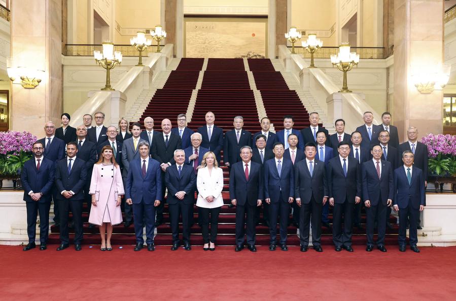 Chinese Premier Li Qiang and Italian Prime Minister Giorgia Meloni pose for a photo with entrepreneur representatives from China and Italy before the opening ceremony of the seventh meeting of the China-Italy entrepreneurs committee, at the Great Hall of the People in Beijing, capital of China, July 28, 2024 (Xinhua/Liu Weibing)