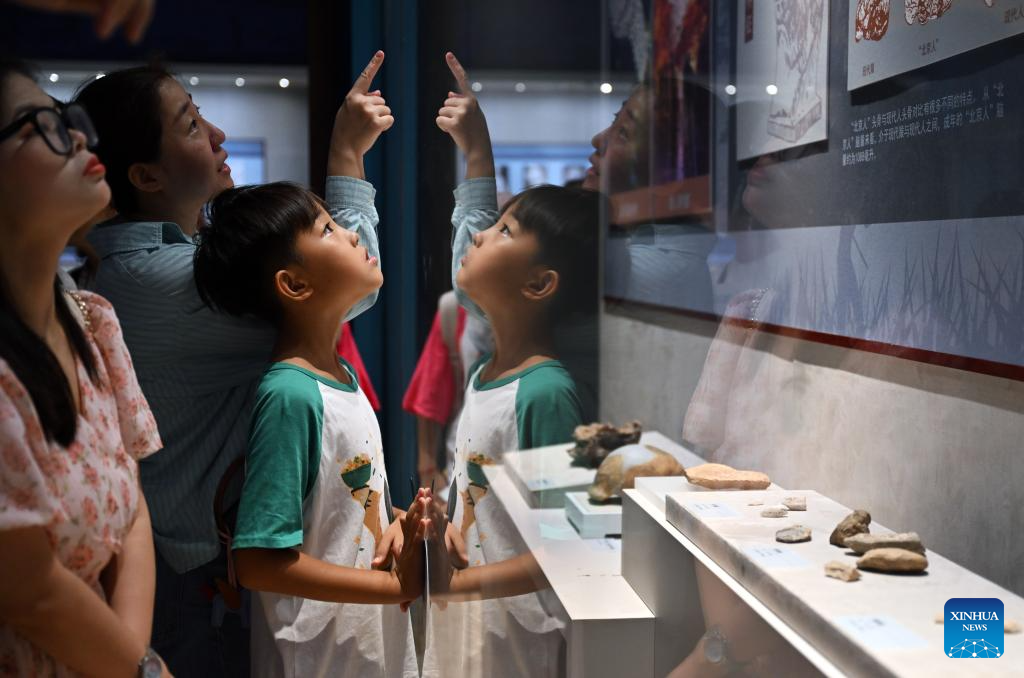 A child visits a replica of a skull of Peking Man during the Zhoukoudian Site Cultural Exhibition at the Hainan Museum in Haikou, south China's Hainan Province, July 30, 2024. The Zhoukoudian Site Cultural Exhibition opened here on Tuesday with a total of 139 pieces of exhibits from the Zhoukoudian Site Museum in Beijing. (Xinhua/Guo Cheng)