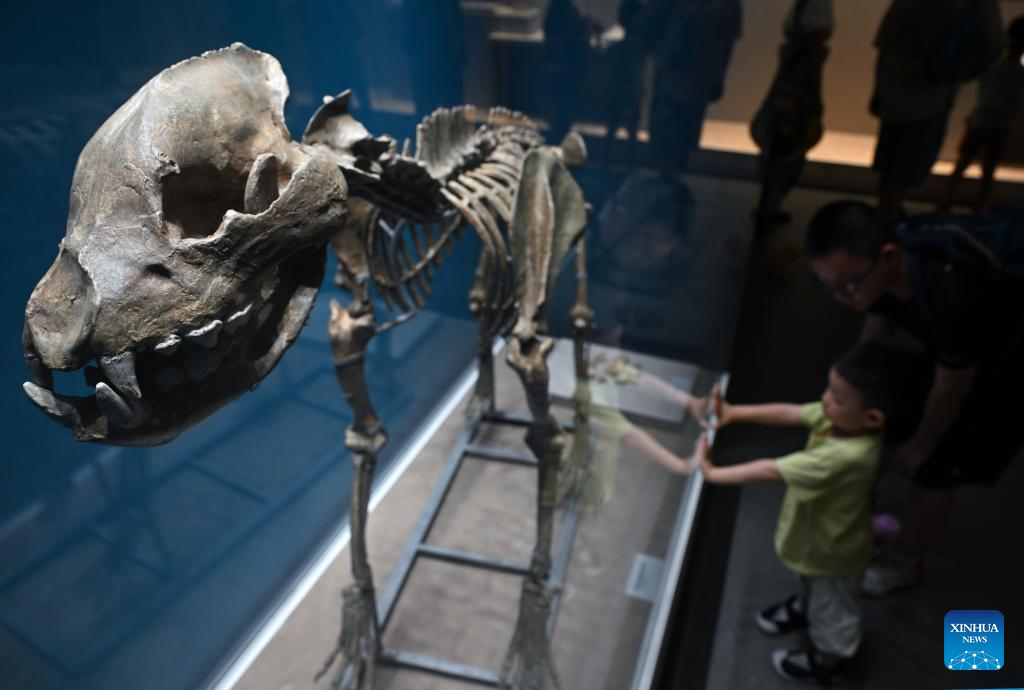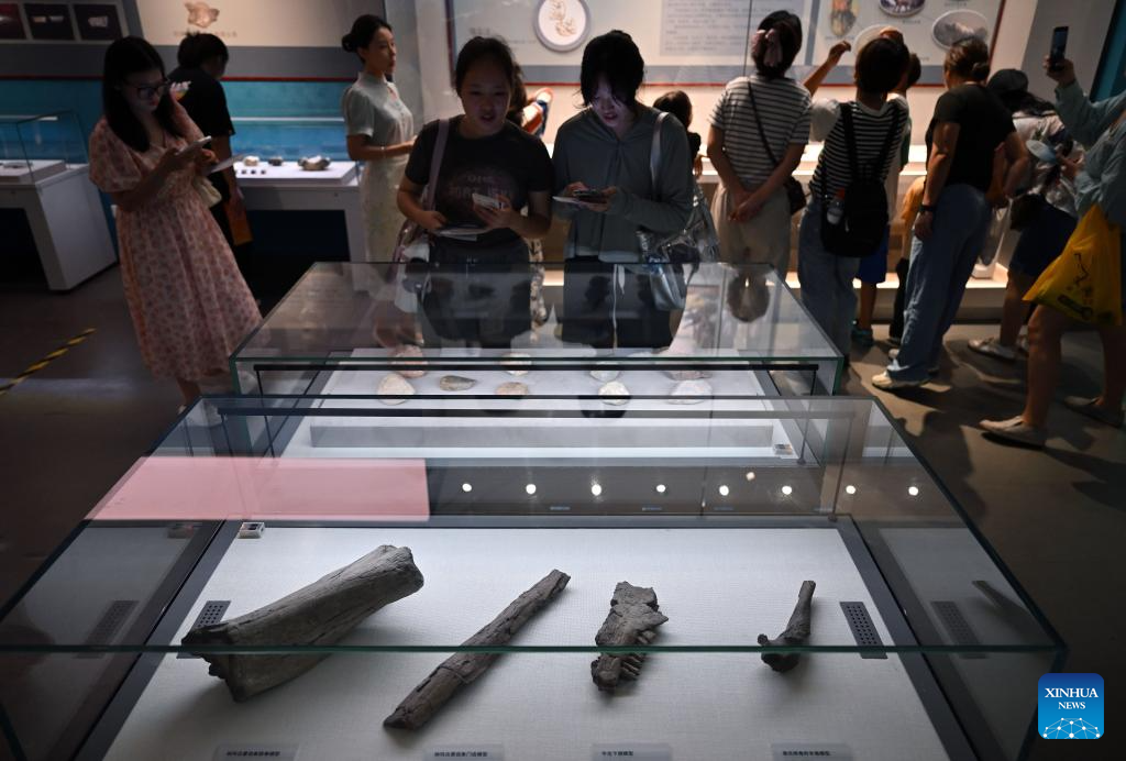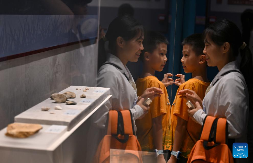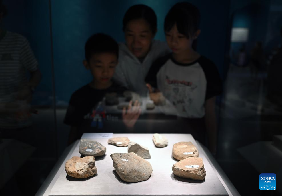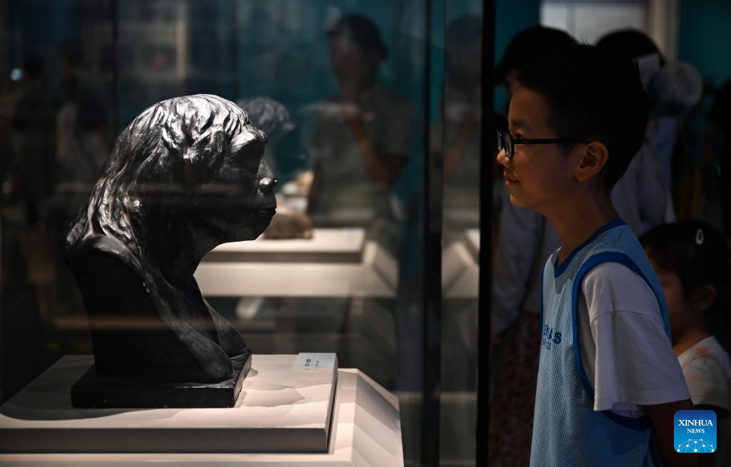Visitors view an exhibit during the Zhoukoudian Site Cultural Exhibition at the Hainan Museum in Haikou, south China's Hainan Province, July 30, 2024. The Zhoukoudian Site Cultural Exhibition opened here on Tuesday with a total of 139 pieces of exhibits from the Zhoukoudian Site Museum in Beijing. (Xinhua/Guo Cheng)