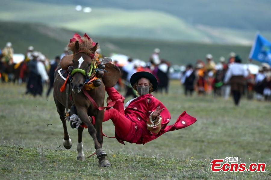 A rider demonstrates his skills at a horse racing event in Litang County, the Tibetan Autonomous Prefecture of Garze, southwest China's Sichuan Province, July 30, 2024. (Photo: China News Service/Liu Zhongjun)