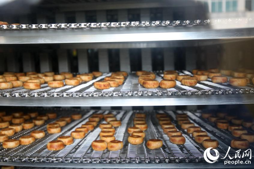 After going through a cooling process, freshly baked chicken floss cakes are transported through the conveyor belt for packaging. (People’s Daily Online/Li Changqian)