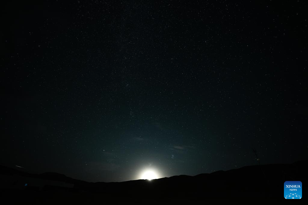 This photo taken on July 31, 2024 shows the starry night sky over the Badain Jaran Desert in north China's Inner Mongolia Autonomous Region. Located in the hyper-arid region of northwestern China, the Badain Jaran Desert is the country's third largest desert and second largest drifting desert.