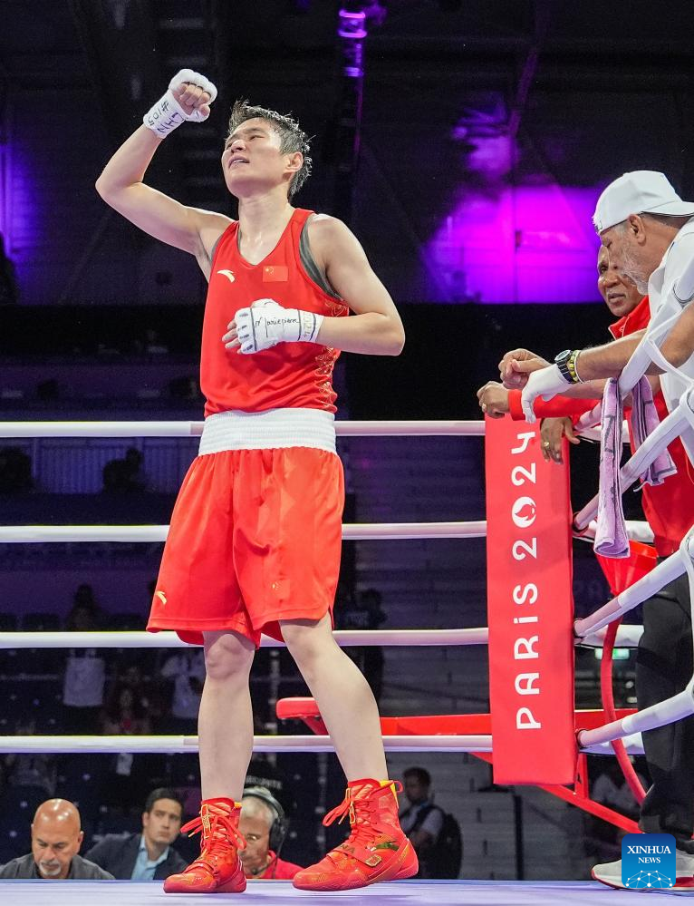 Yang Wenlu of China celebrates winning the women's 60kg quarterfinal of boxing at the Paris 2024 Olympic Games in Paris, France, July 31, 2024. (Xinhua/Jiang Wenyao)