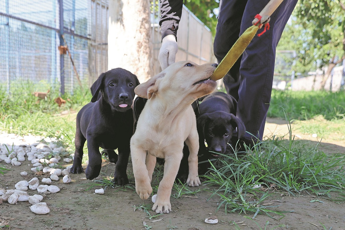 Puppies that are about 3 months old practice retrieving skills at the center. (WANG ZHUANGFEI/CHINA DAILY)
