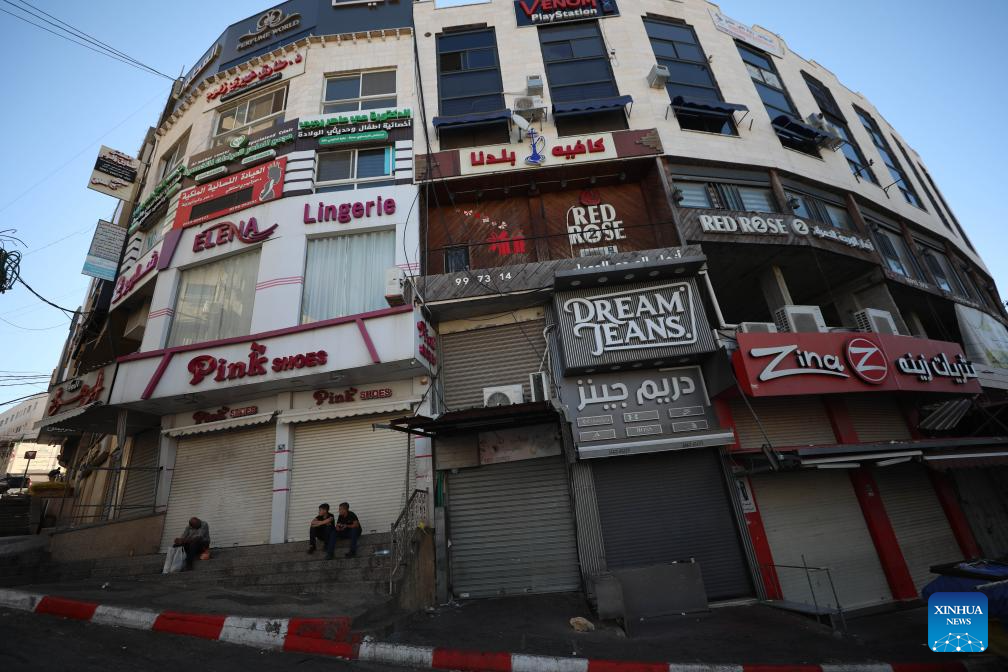 People sit in front of closed shops during a general strike in the West Bank city of Nablus, on July 31, 2024. The Palestinian National and Islamic Forces on Wednesday declared a general strike across Palestine, condemning the assassination of Hamas Politburo Chief Ismail Haniyeh. (Photo by Ayman Nobani/Xinhua)
