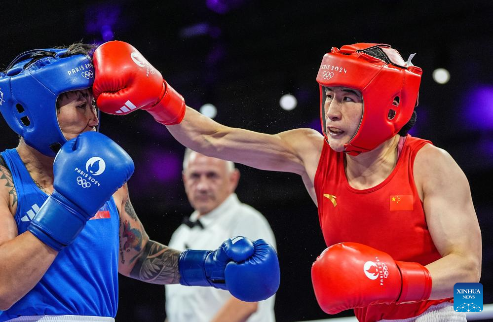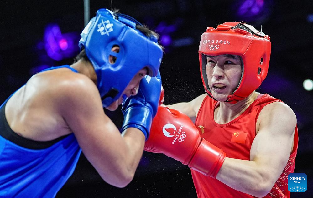 Li Qian (R) of China competes against Hergie Bacyadan of the Philippines during the women's 75kg preliminary round of 16 of boxing at the Paris 2024 Olympic Games in Paris, France, July 31, 2024. (Xinhua/Jiang Wenyao)