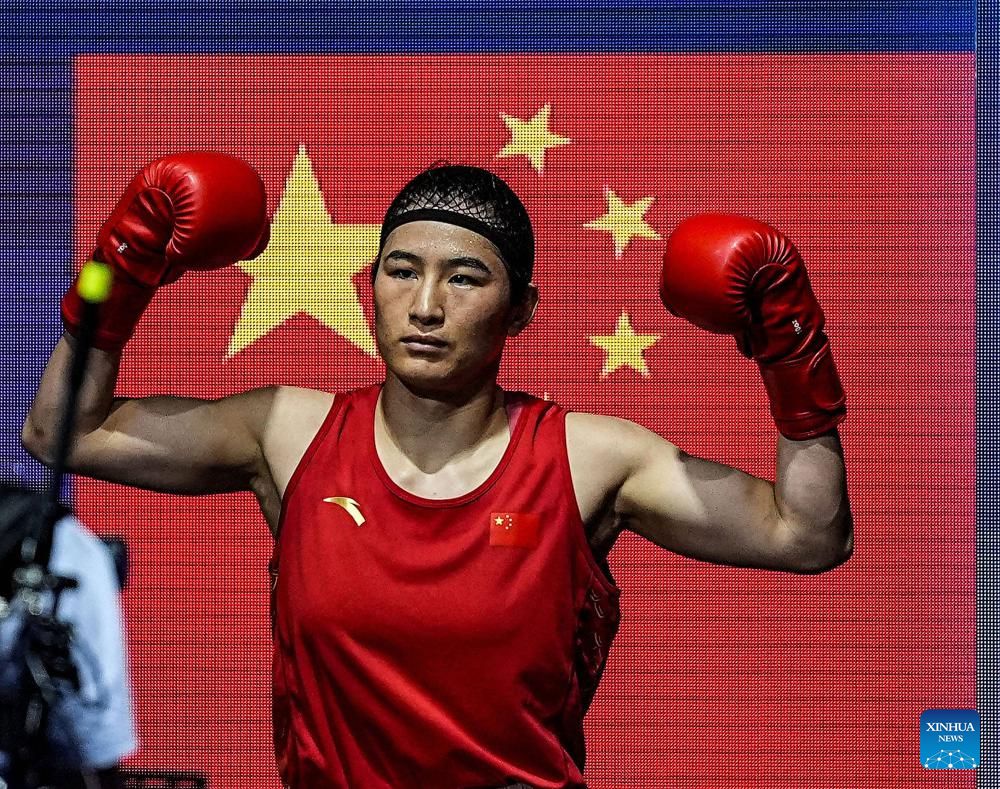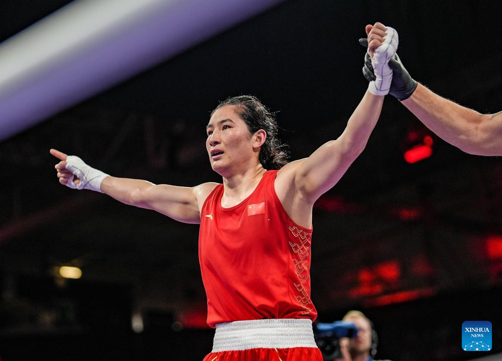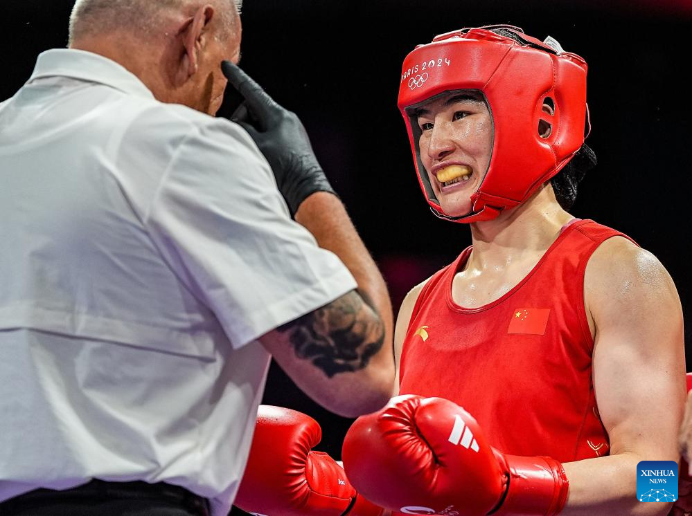 Li Qian (R) of China reacts before the women's 75kg preliminary round of 16 of boxing at the Paris 2024 Olympic Games in Paris, France, July 31, 2024. (Xinhua/Jiang Wenyao)
