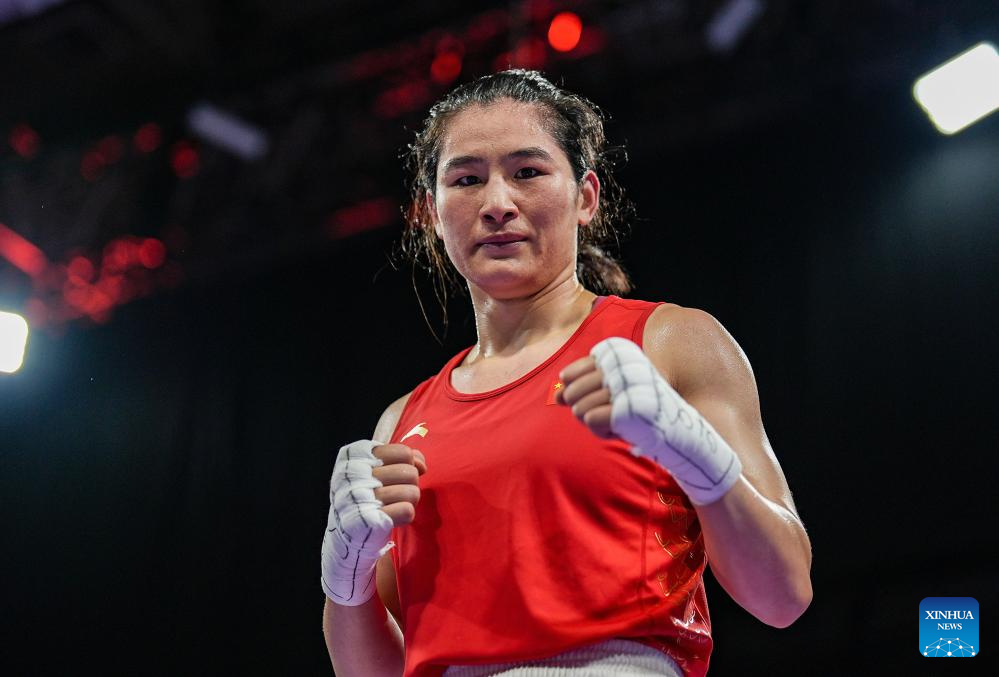 Li Qian of China reacts before the women's 75kg preliminary round of 16 of boxing at the Paris 2024 Olympic Games in Paris, France, July 31, 2024. (Xinhua/Jiang Wenyao)